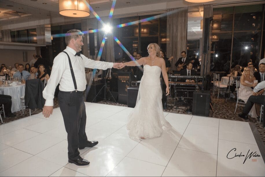 In the heart of an elegant banquet hall, the bride and groom glide across a pristine white floor, two figures joined in a harmonious dance, their love lighting up the room like a beacon. Around them, guests sit captivated in their seats, dressed to impress and ready for an evening of marvels. High above, Black Tie Productions orchestrates an unparalleled symphony that elevates the night to legendary heights. To ensure your celebration reaches such epic proportions with absolute ease—venture forth and secure an instant price quote from Michigans premier wedding DJ. Forge memories destined to be as unforgettable as any heroic tale!. :The Event Heroes at Black Tie Productions