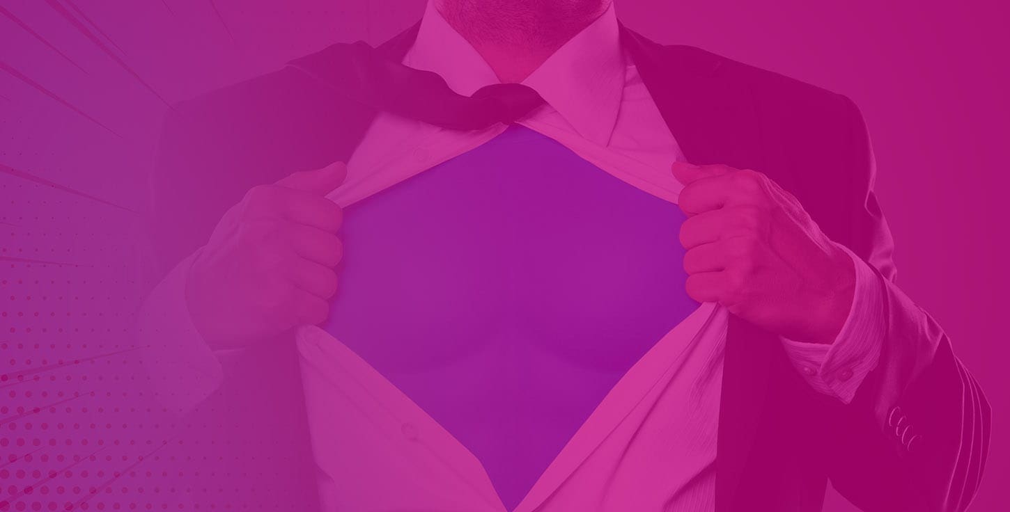 Black Tie Productions: A person pulls open their dress shirt and suit jacket, unveiling a blue shirt underneath. With a pink overlay and comic-style design, the superhero-themed image is enhanced by halftone patterns and dynamic lines. Perfect for fun wedding photo booth backdrops or party entertainment ideas. :Your Event Heroes