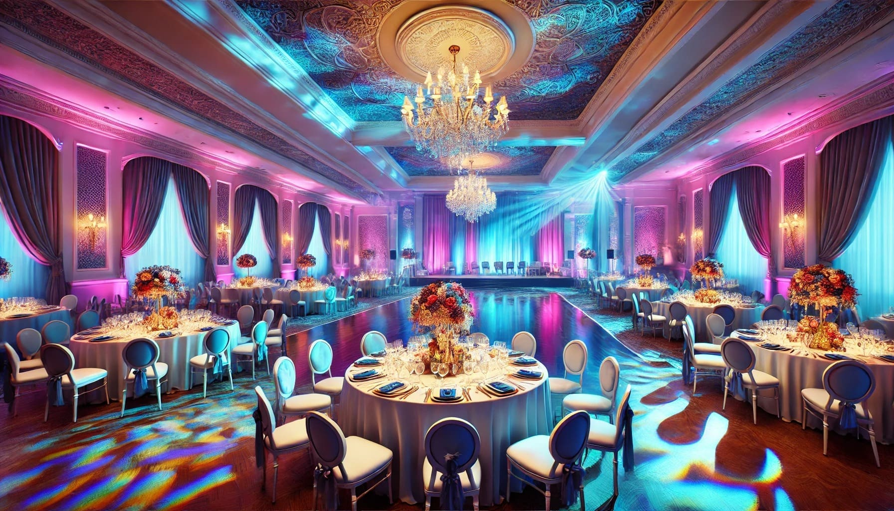 Unleash the power of elegance with Event Heroes majestic ballroom! Here, amidst a constellation of round tables primed for an epic gathering, sophistication reigns supreme. Swathed in the bold hues of pink and blue, this grand chamber dazzles with shimmering chandeliers and intricate ceiling designs. Ready to transform any event into a legendary occasion!. :The Event Heroes at Black Tie Productions