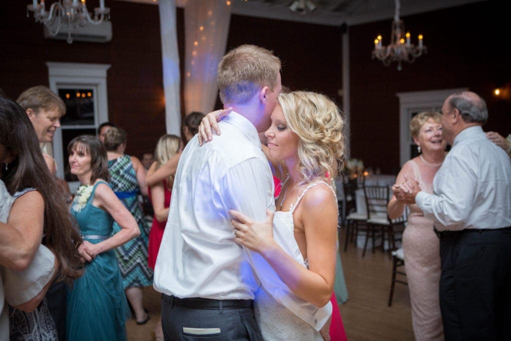 Black Tie Productions: A couple embraces on a dance floor during a lively wedding reception. Surrounded by other dancing couples, the venue glows with chandeliers, white drapery, and string lights. The fun Michigan wedding DJ keeps the atmosphere vibrant as the woman in a sleeveless dress dances with her partner in a white shirt. :Your Event Heroes