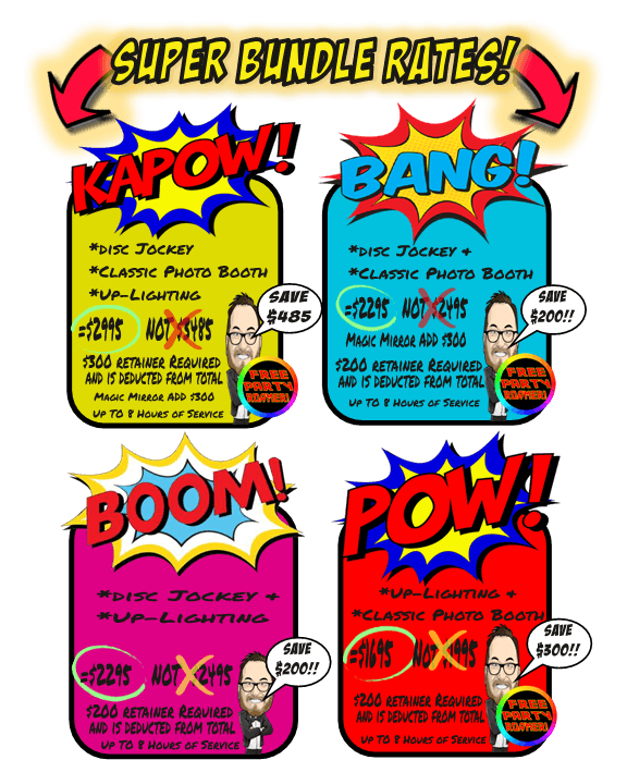Black Tie Productions: A promotional image with comic book-style graphics and bold text showcases four package deals: KAPOW!, BANG!, BOOM!, and POW!. Each includes a description and pricing. A surprised person illustration appears at the bottom of each package, emphasizing offer details and savings for Michigan wedding entertainment. :Your Event Heroes