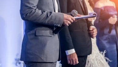 Under the gleaming spotlight of elegance, three champions of grace and poise ascend to the stage. Clad in black tie armor, they stand tall and proud, wielding microphones like instruments of truth and justice. In their hands, a symphony of papers—a script imbued with the power to captivate hearts. They are the heralds of Black Tie Productions at this grand ceremony, ready to orchestrate an evening where sophistication reigns supreme!. :The Event Heroes at Black Tie Productions