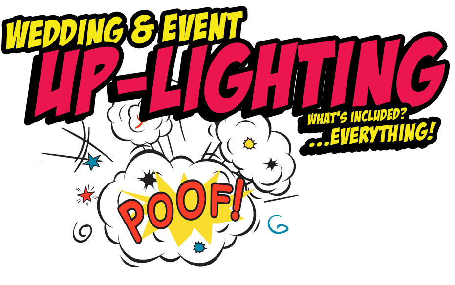 SPLASH! In bold, spectacular comic book flair comes the ultimate dynamic duo—Wedding & Event Up-Lighting! KA-POW! Whats included? *EVERYTHING!* ZAP through your special day with mesmerizing lights and brilliant colors, setting the perfect scene for an epic celebration. Introducing Michigans own superhero DJ team, equipped with dazzling event lighting capabilities and instant price quote power. With a resounding POOF!, witness your wedding dreams transform into vibrant reality. Unleash the extraordinary impact of unforgettable lighting for your legendary event!. :The Event Heroes at Black Tie Productions
